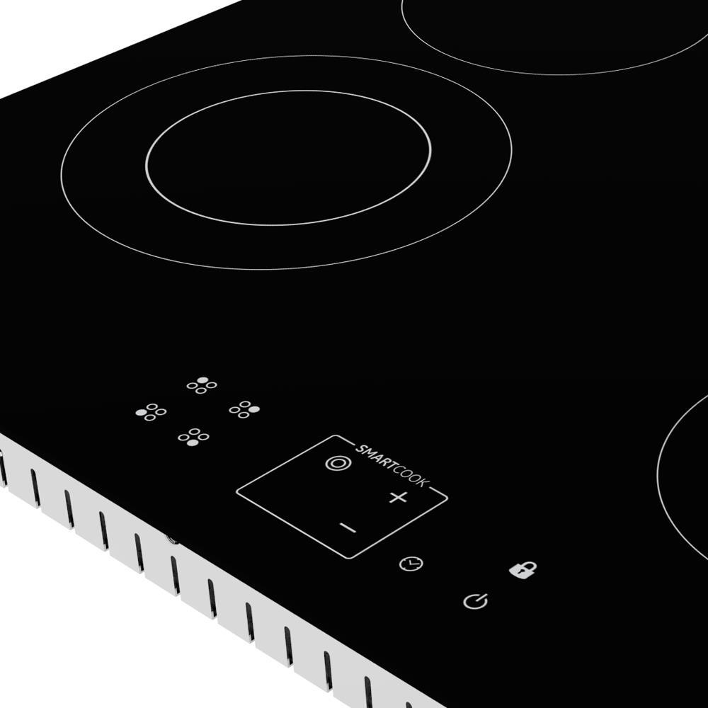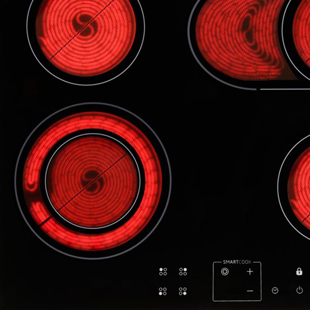 Anafe vitrocerámico eléctrico empotrable. Touch control. Vidrio SCHOTT ® de alta resistencia. 4 zonas de cocción: 2 de 1200W, 1 Dual Ring de 700 a 1700W, 1 Extensible de 1100 a 2000W. 9 niveles de potencia. Apagado de seguridad automático. Indicador de calor residual. Función Children Safety Lock. Timer digital. Origen: China.