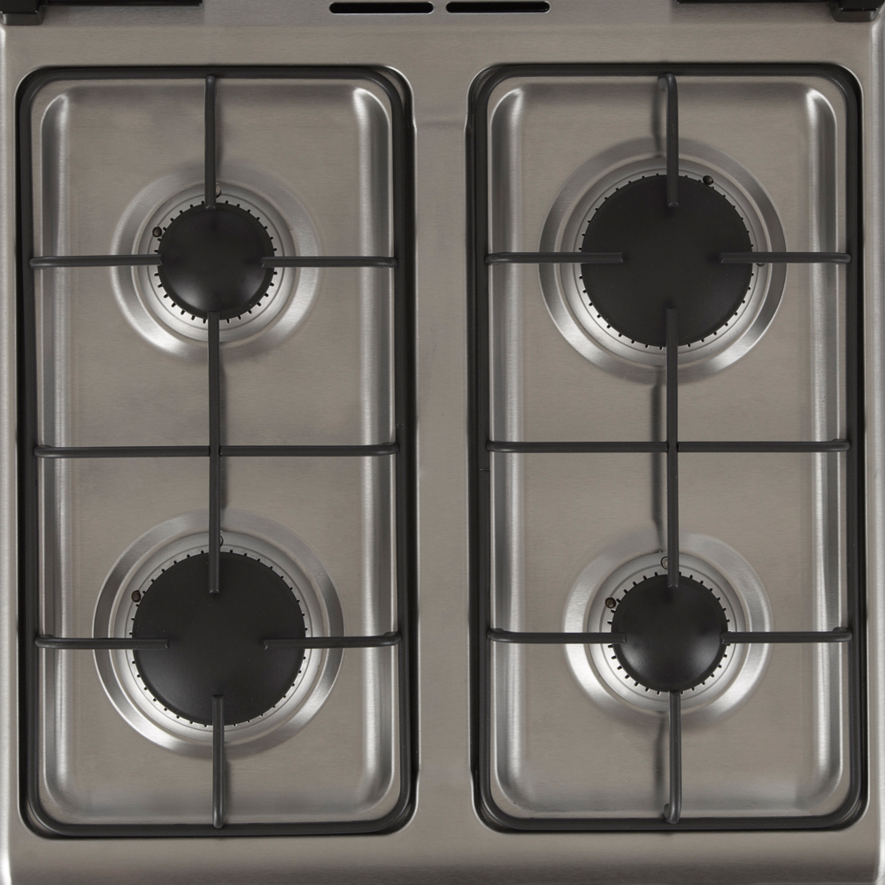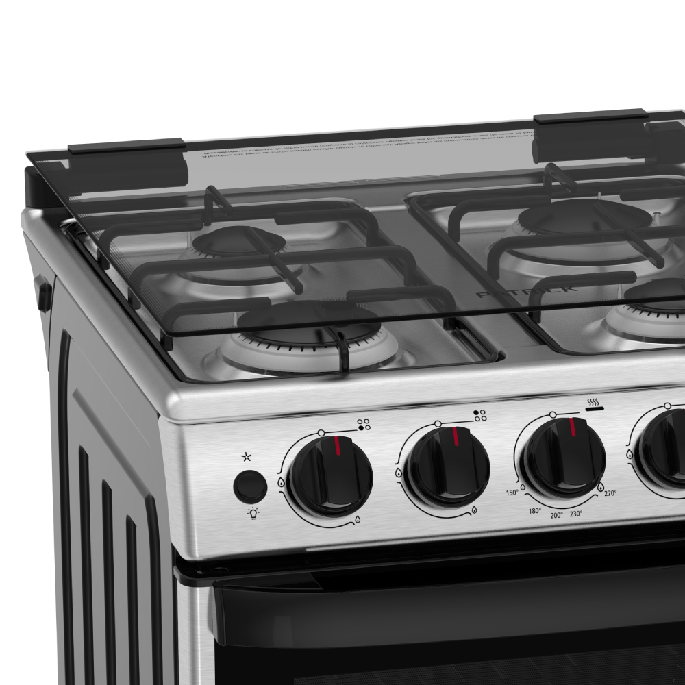 Sistema Multigas. Eficiencia Gas A. Color Inox. Capelo de vidrio templado. Puerta de horno con vidrio panorámico negro. 2 parrillas de alambrón negro brillante. Termostato en horno. Válvula de seguridad y encendido eléctrico en horno y hornallas. Perillas de gran resistencia y durabilidad. 2 parrillas en horno deslizables de alambrón niquelado. Hornallas fast cook con diseño curvo: 2 jumbo + 2 estándar. Cajón calienta platos. Incluye bandeja en horno. Origen Argentina.