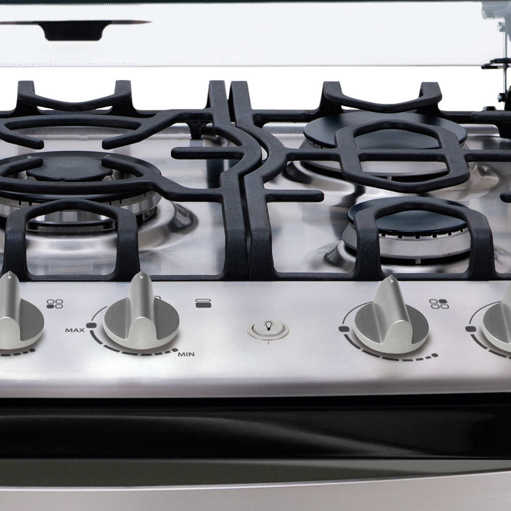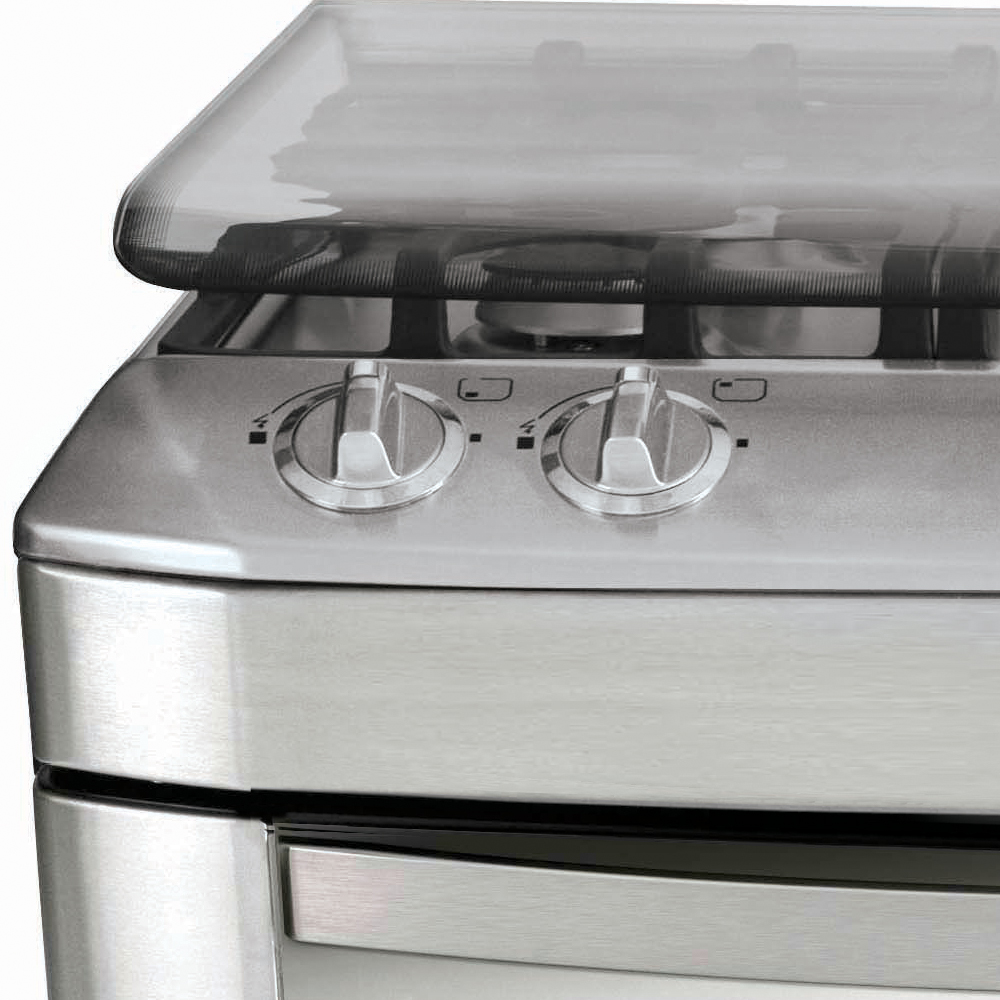 Sistema Multigas. Color inoxidable. Parrillas de fundición. 5 hornallas. 1 Hornalla Triple Ring: Triple llama. Puerta del horno con doble vidrio espejado. Encendido eléctrico en horno y hornallas. Grill eléctrico. Horno autolimpiante con luz interior. Origen: Argentina.