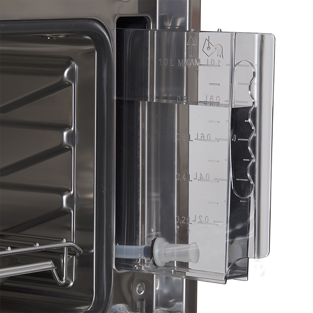 Horno eléctrico a vapor con convección empotrable. Color Inoxidable. Capacidad 34 Lts. Control digital. Display LED. Encendido eléctrico. Cocción a vapor. Limpieza asistida por vapor. Puerta aislante. Luz interior. Funciones: asar, hornear, cocción a vapor, descongelar, autolimpieza. Modo apagado automático. Origen: Italia.