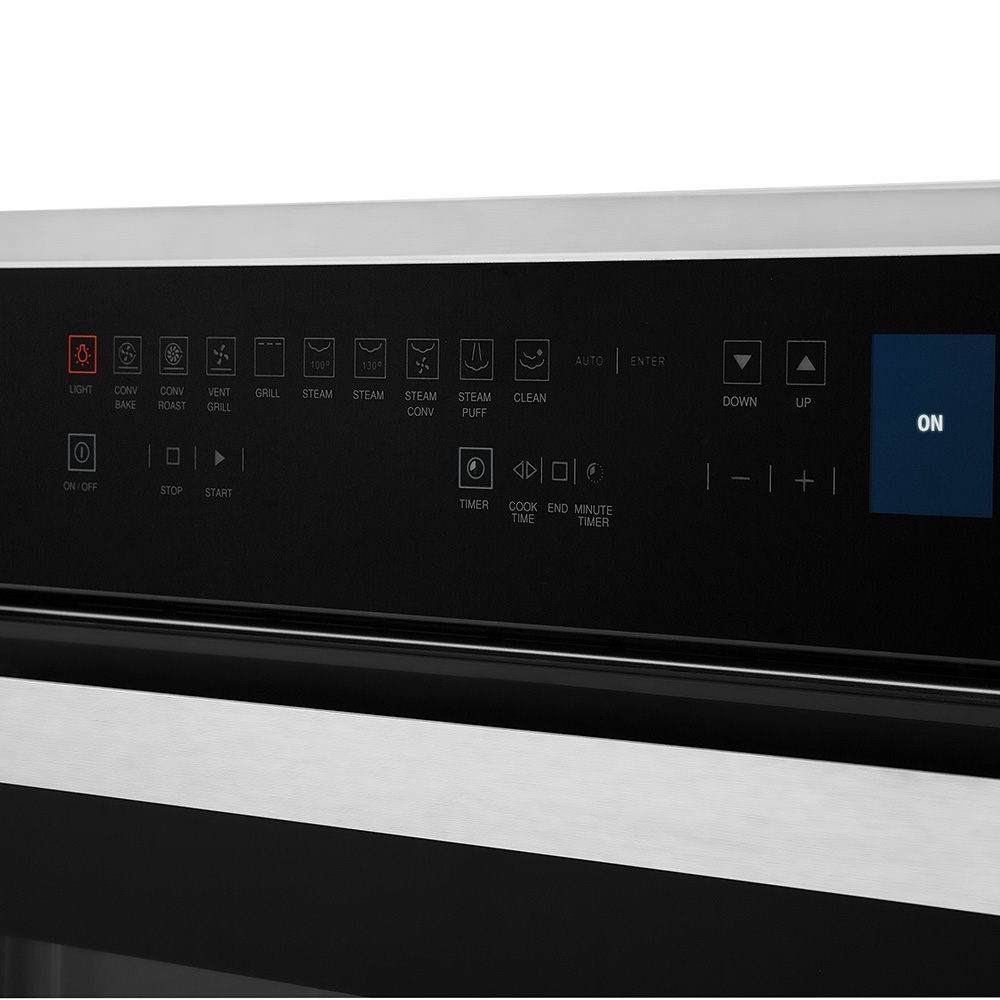 Horno eléctrico a vapor con convección empotrable. Control digital. Display LED. Encendido eléctrico. Cocción a vapor. Limpieza asistida por vapor. Puerta aislante. Luz interior halógena. Funciones: asar, hornear, cocción a vapor, descongelar, autolimpieza. Modo apagado automático. Origen: Italia.