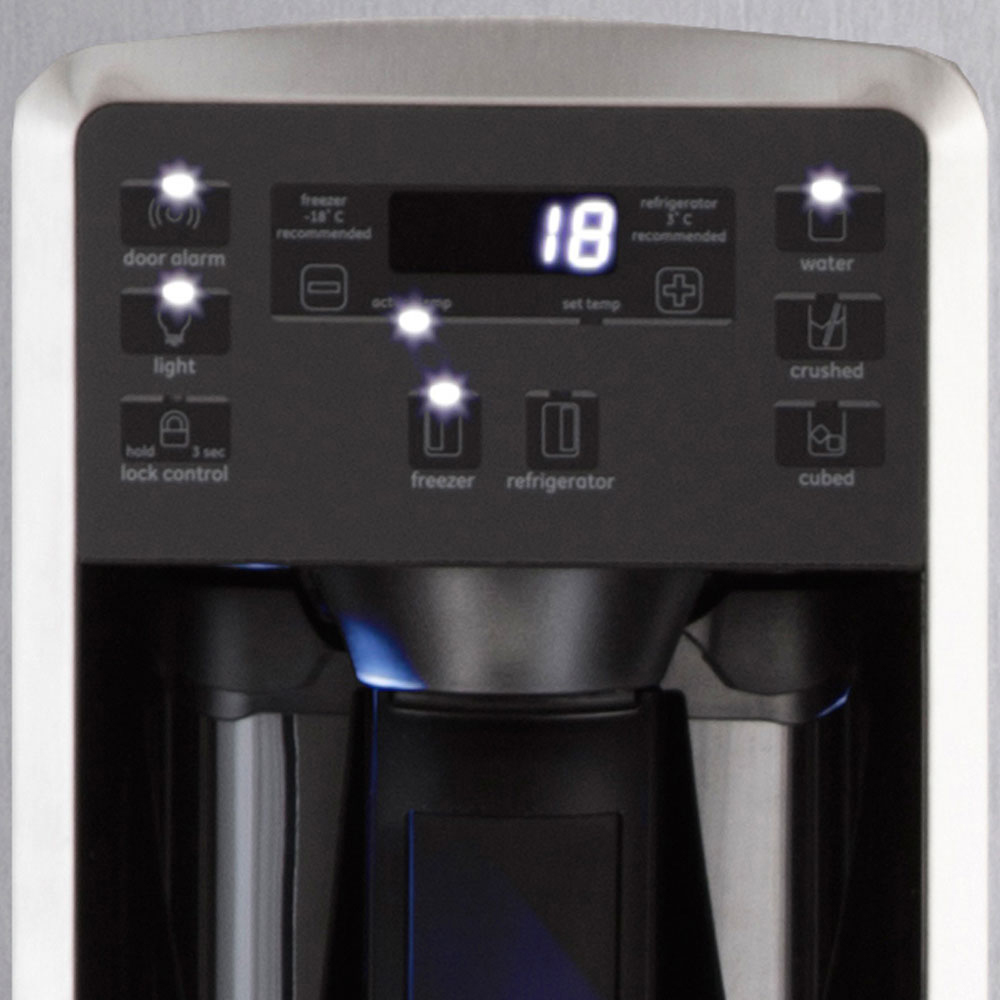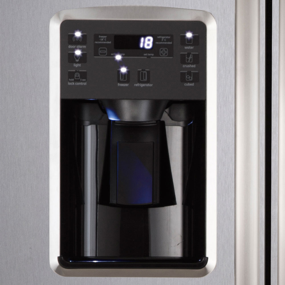 Heladera Side by side. No frost. Eficiencia energética A+. Color Inoxidable. Capacidad bruta 719 litros. Capacidad neta 644 litros. Capacidad neta freezer 208 litros. Capacidad neta refrigerador 436 litros. Control de temperatura exterior digital. Dispenser de agua. Fabrica de hielo. Estantes de vidrio templado con bordes antiderrales. Porta latas. Alarma puerta abierta. Cajón de verduras humidity control. Origen México.