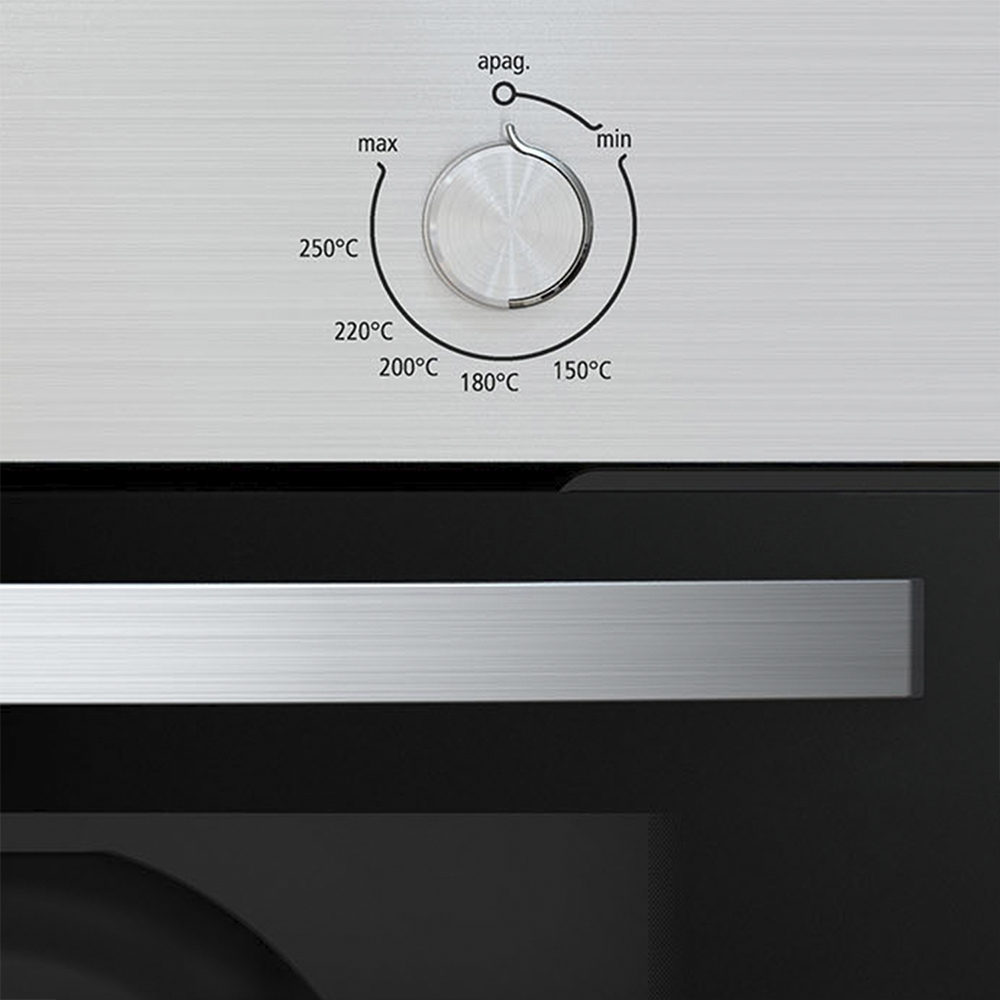 Horno eléctrico empotrable. Color inoxidable. Capacidad 60 Lts. Encendido eléctrico. Puerta de vidrio panorámica. Control de temperatura. Tecnología de limpieza Easy Clean Pro. Timer mecánico. Iluminación interior con switch. Origen México.