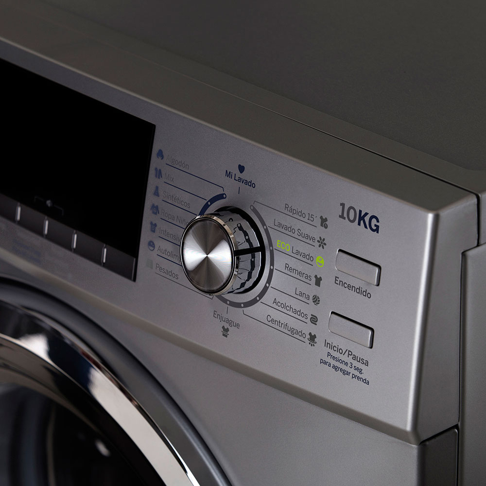 Lavarropas carga frontal. Capacidad 10 Kg. 1600 RPM. Color Silver. Motor Inverter. Tambor con tecnología honey comb. Display LCD. 16 programas de lavado. Programa Mi lavado. Inicio diferido. Bloqueo para niños. Nigh wash. Luz interior.