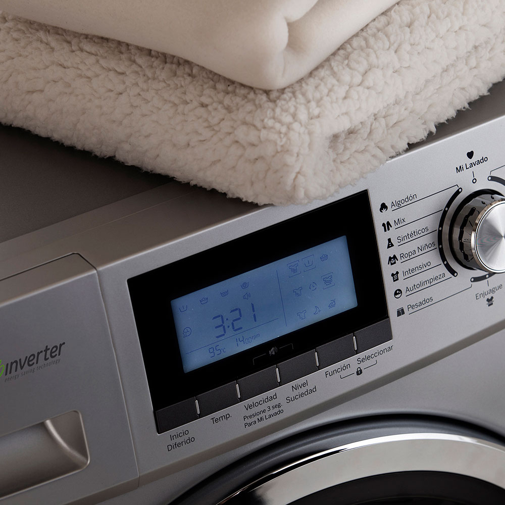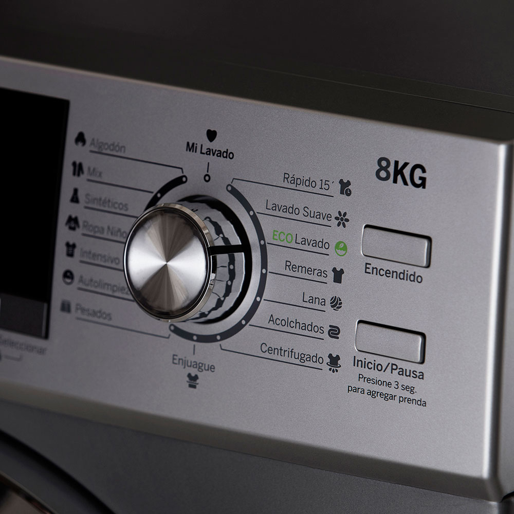 Lavarropas carga frontal. Capacidad 8 Kg. 1400 RPM. Color Silver. Motor Inverter. Tambor con tecnología honey comb. Display LCD. 16 programas de lavado. Programa Mi lavado. Inicio diferido. Bloqueo para niños. Nigh wash.