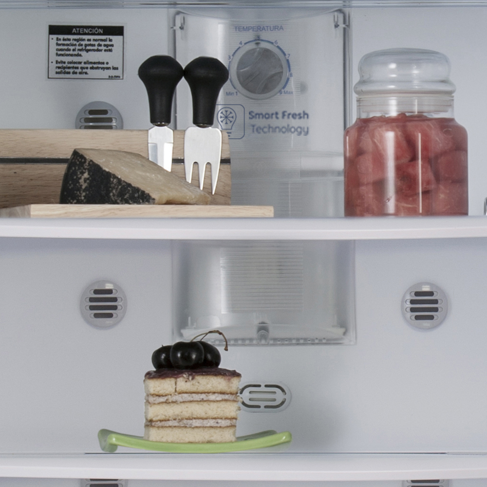 Eficiencia energética A. Heladera No Frost. Sistema de enfriamiento Smart Fresh Technology®. Compartimiento de enfriado y congelado rápido. Ice Factory®. Estantes de vidrio templado con bordes antiderrame. Textura interior Easy Clean®. Luz LED en refrigerador. Origen: Argentina.