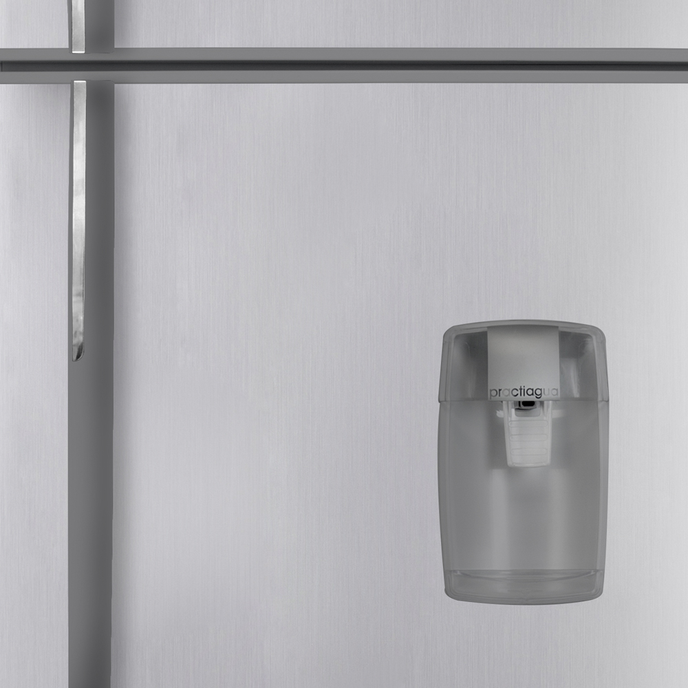 Eficiencia energética A. Heladera con freezer Cycle Defrost. Dispenser de agua con 2 litros de capacidad. Capacidad bruta de 394 L. Estantes regulables en altura en freezer y refrigerador. Anaqueles en contrapuerta para botellas y alimentos regulables en altura. Luz interior LED. Origen: Argentina.